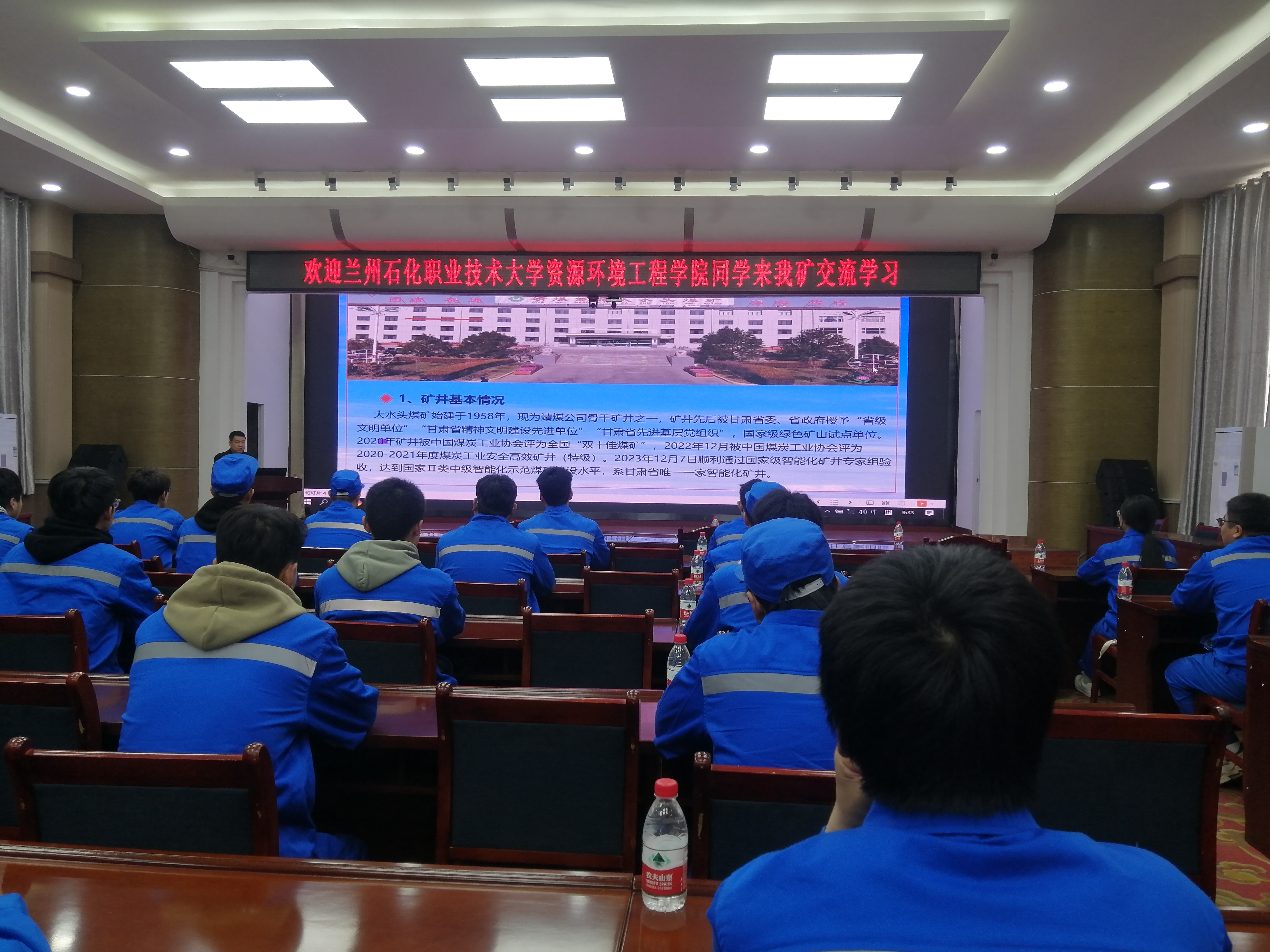 本次实习得到了企业的高度重视,对学生的到来表示了热烈欢迎。企业相关技术人员通过系列讲座,分别介绍了矿井基本情况、企业文化理念、煤矿智能化开采应用与取得的进展、煤矿安全生产等。讲座结束后,企业技术人员带领学生参观了地面综合调度中心、煤矿智能化开采地面控制中心、通风机房等企业重点工作区域。